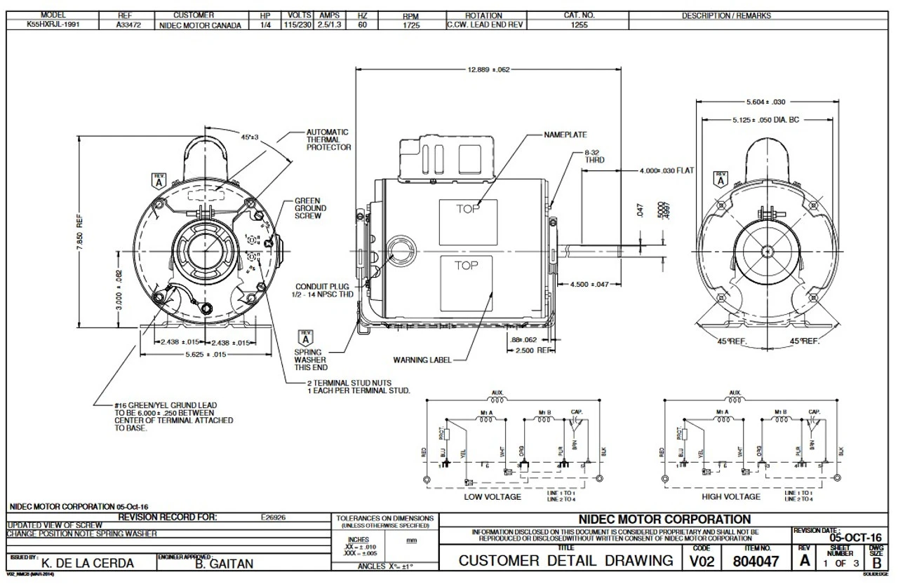 1255 Nidec | 1/4 Hp 1725 RPM 1-Speed 115/230V; 5.6″ Blower Motor