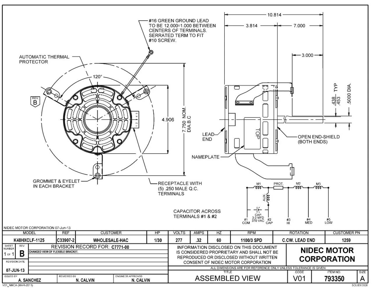 1259 Nidec | 1/3 Hp 1100 RPM 3-Speed 277V; 5.0″ AC Motor