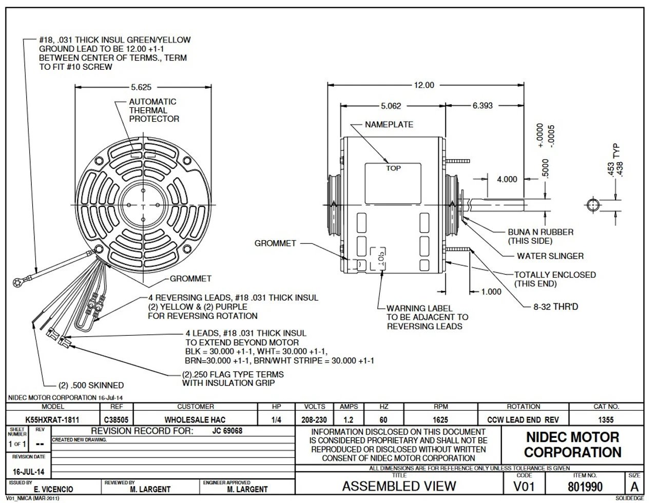 Permanent Split Capacitor Motor. Automatic Overload Protection. Continuous Duty; Open Drip-Proof Over Enclosure; Class B Insulation; 60C Ambient Temperature; 30″ Leads, K055RAT1811012B