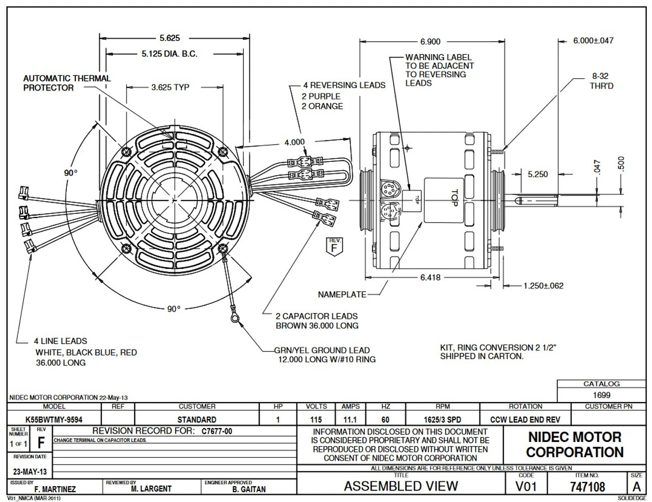 Permanent Split Capacitor Motor. Automatic Overload Protection. Continuous Duty; Open Air Over Enclosure; Class B Insulation; 40C Ambient Temperature; 36″ Leads, 60 Hertz. K055TMY9594012B.