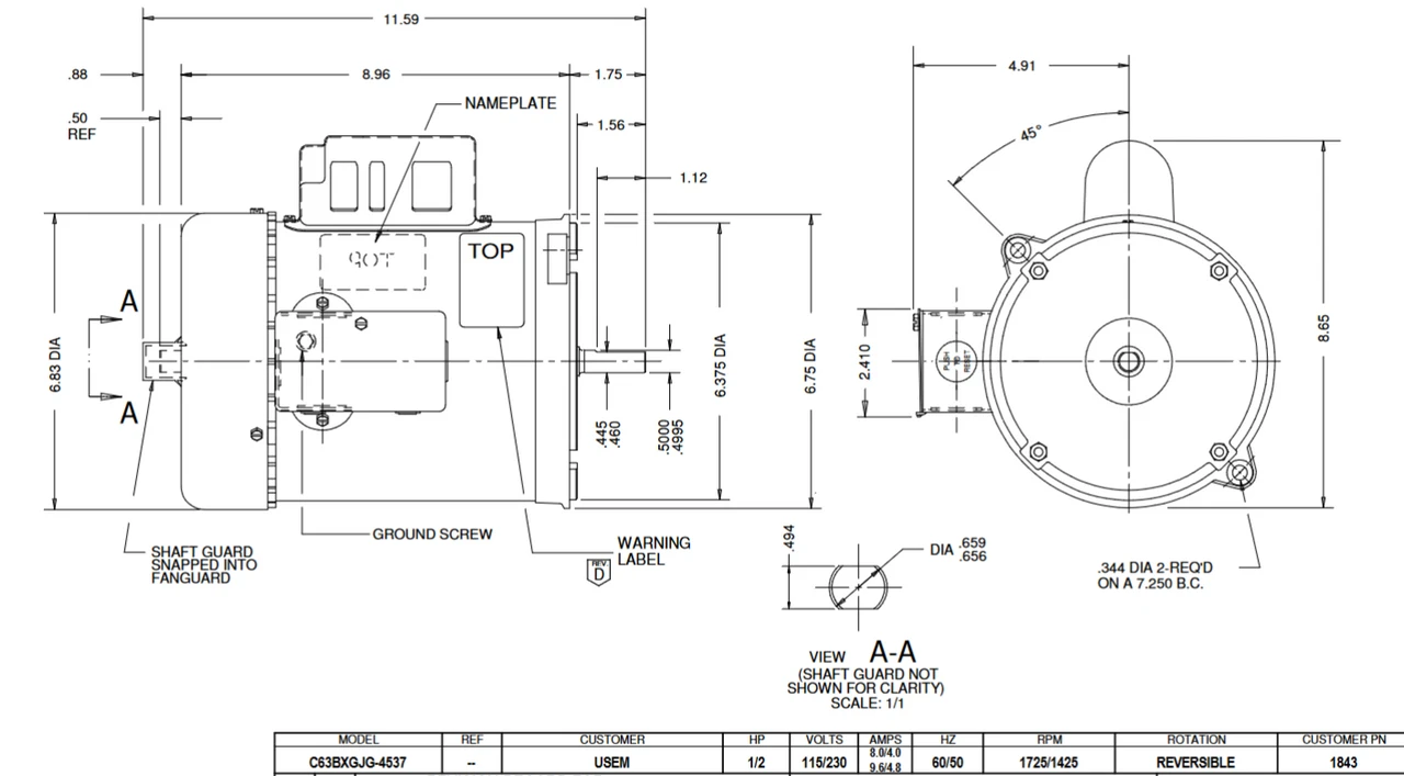 1843 Nidec 1/2 HP 1800 RPM ( 1 Speed) 115/230V 56YZ Frame TEFC Auger Motor