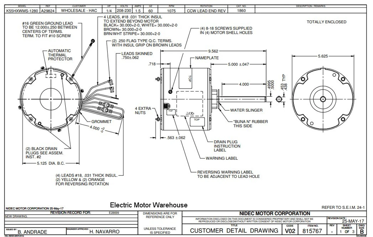 Permanent Split Capacitor Motor. Automatic Overload Protection. Continuous Duty; Totally Enclosed Air Over Enclosure; Class B Insulation; 60C Ambient Temperature; 30″ Leads