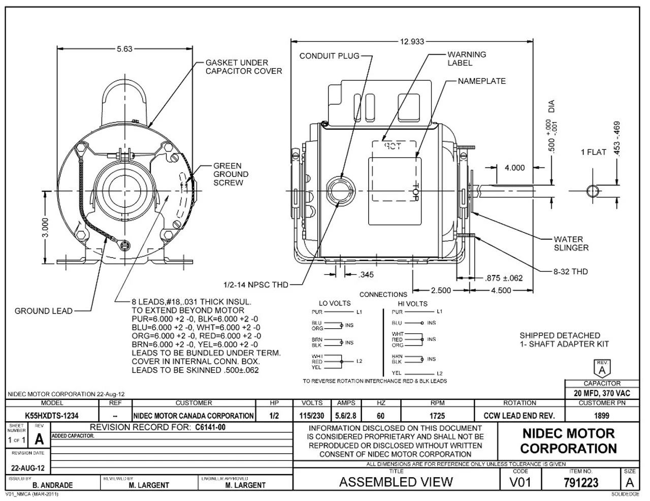 Permanent Split Capacitor Motor. Automatic Overload Protection. Continuous Duty; Totally Enclosed Air Over Enclosure; 40C Ambient Temperature; 60 Hertz. K055DTS1234012B. Ventilation Direct Drive Blower Motor.