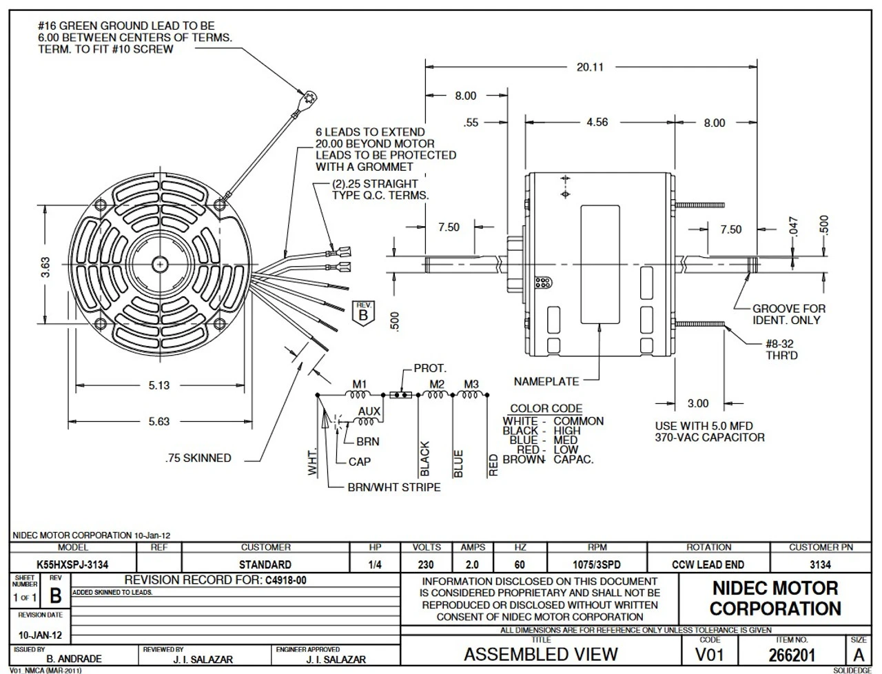 Permanent Split Capacitor Motor. Automatic Overload Protection. Continuous Duty; Open Drip Proof Enclosure; Class B Insulation; 40C Ambient Temperature; 20″ Leads, 60 Hertz. K055SPJ3134801B.