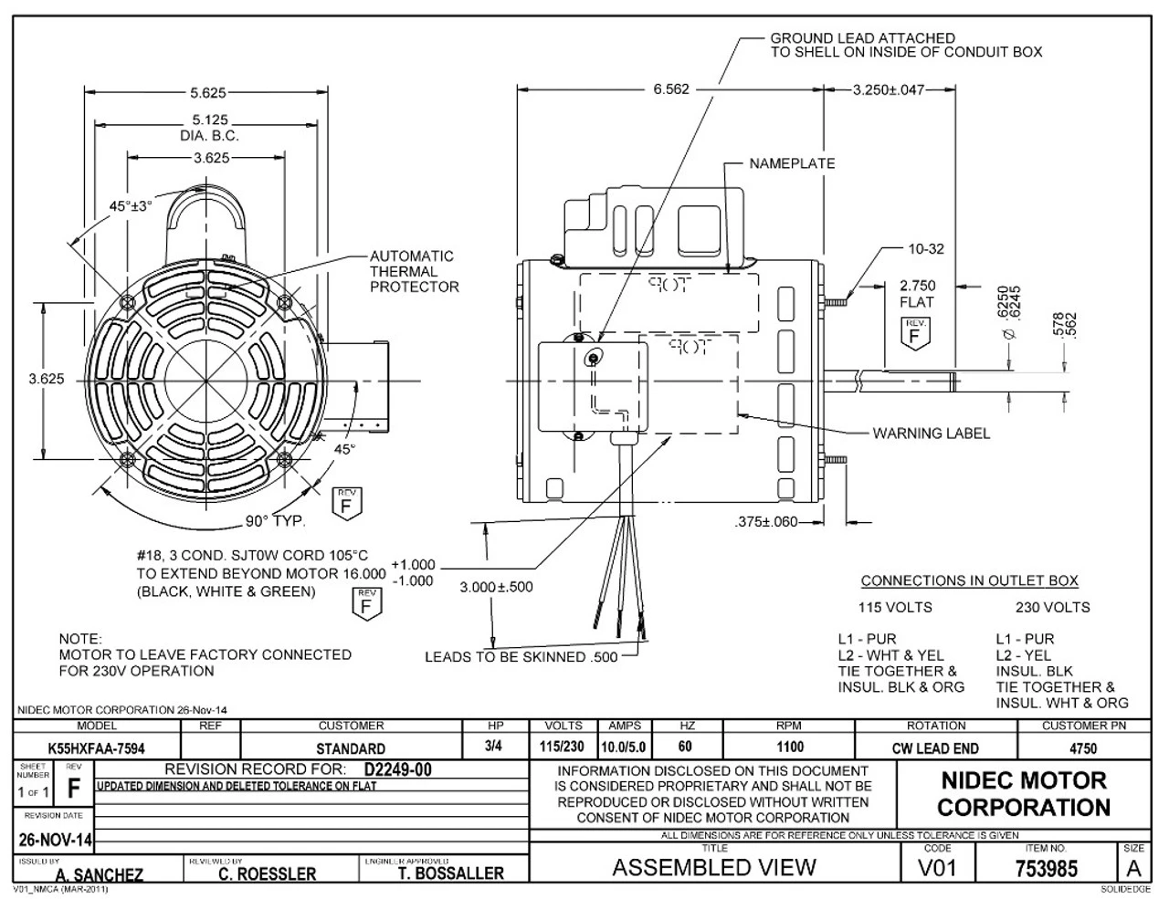 Permanent Split Capacitor Motor. Automatic Overload Protection. Continuous Duty; Open Enclosure; 40C Ambient Temperature; 15″ Leads, 60 Hertz. K055FAA7594023B.