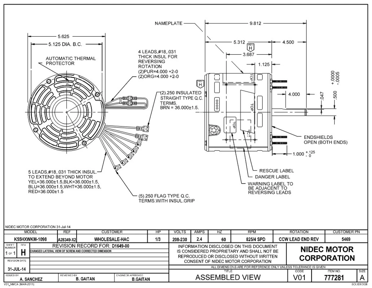 Permanent Split Capacitor Motor. Automatic Overload Protection. Continuous Duty; Open Air Over Enclosure; Class B Insulation; 40C Ambient Temperature; 36″ Leads, 60 Hertz. K055WKM1098012B.