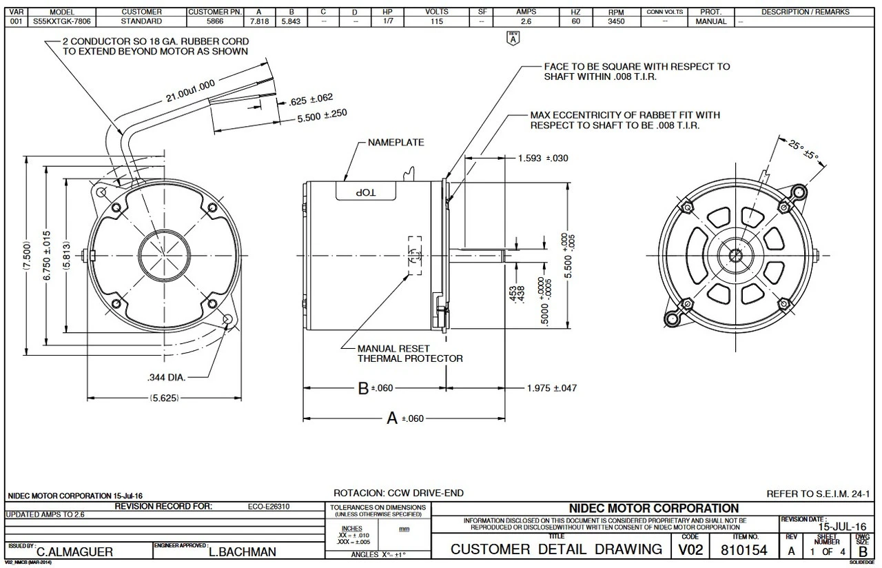 Split Phase Oil Burner Motor. Manuel Overload Protection. Continuous Duty; Open Enclosure; Class B Insulation; 40C Ambient Temperature