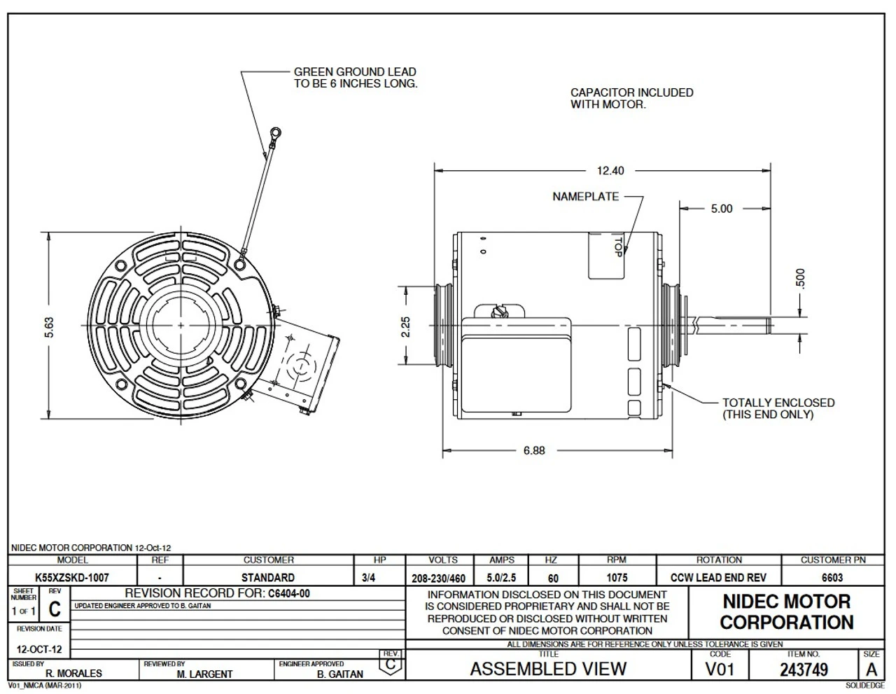 Permanent Split Capacitor Motor. Automatic Overload Protection. Continuous Duty; Open Drip Proof Enclosure; Class B Insulation; 40C Ambient Temperature; Conduit box, K055SKD1007892B
