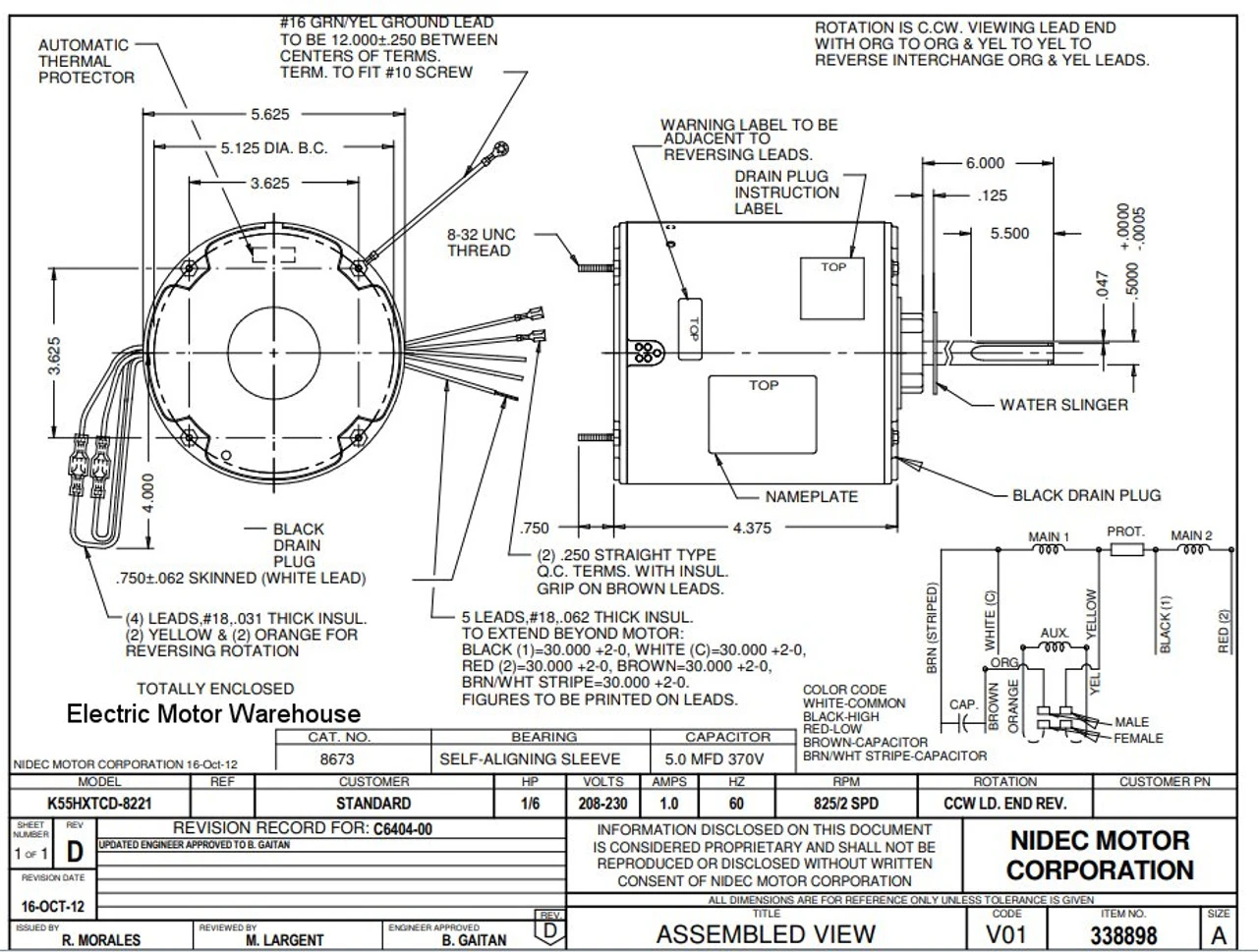Permanent Split Capacitor Motor. Automatic Overload Protection. Continuous Duty; Totally Enclosed Air Over Enclosure; Class B Insulation; 60C Ambient Temperature; 30″ Leads, K055TCD8221012B