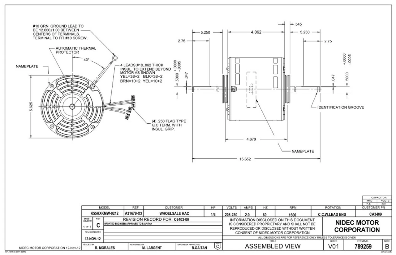 CA3409 Nidec | 1/3 Hp, 1600 RPM 1-Speed 208-230V Carrier Blower Motor