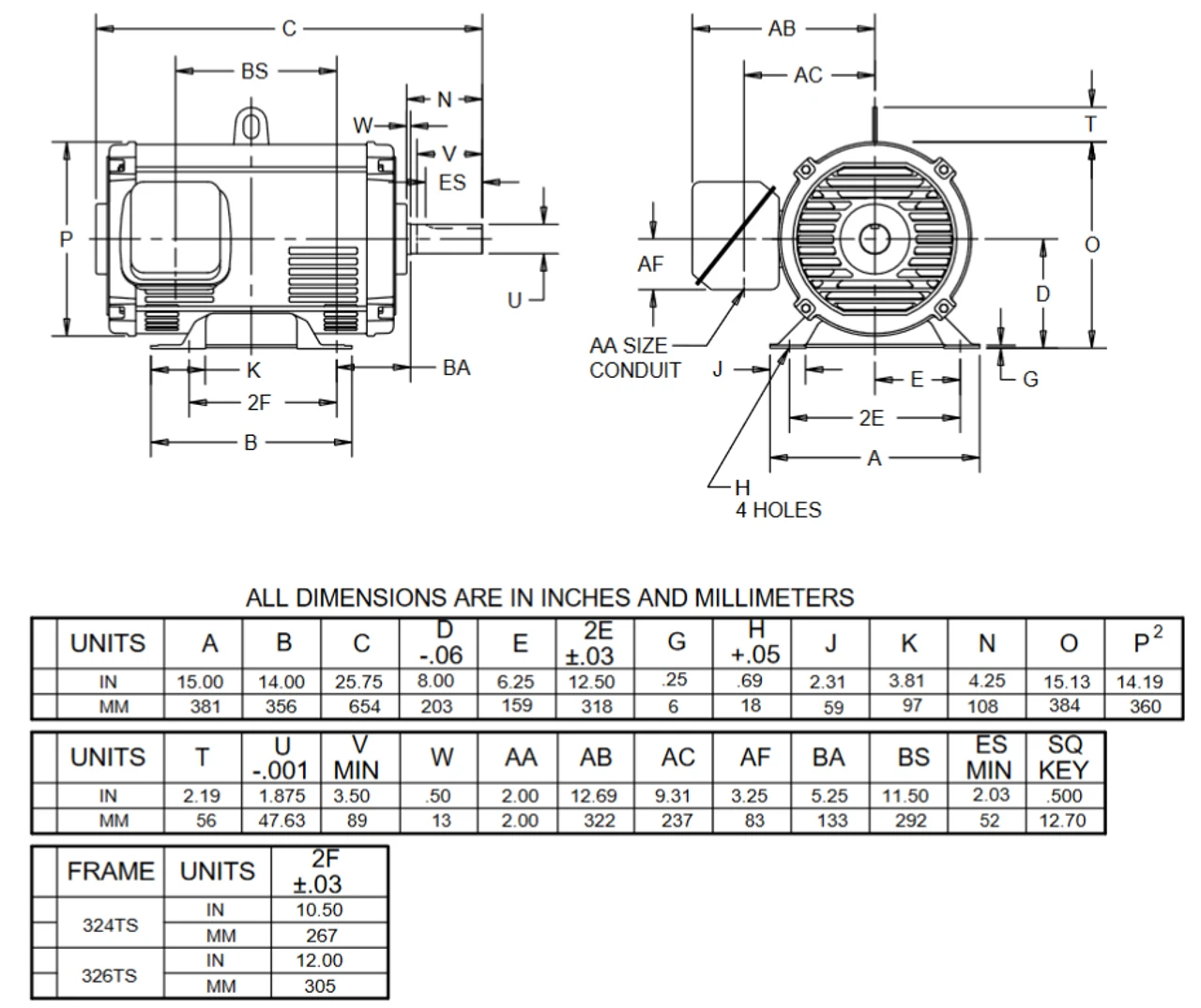 - NEMA 326TS Rolled Steel Frame, Keyed Shaft 1 7/8″ Diameter x 3 3/4″