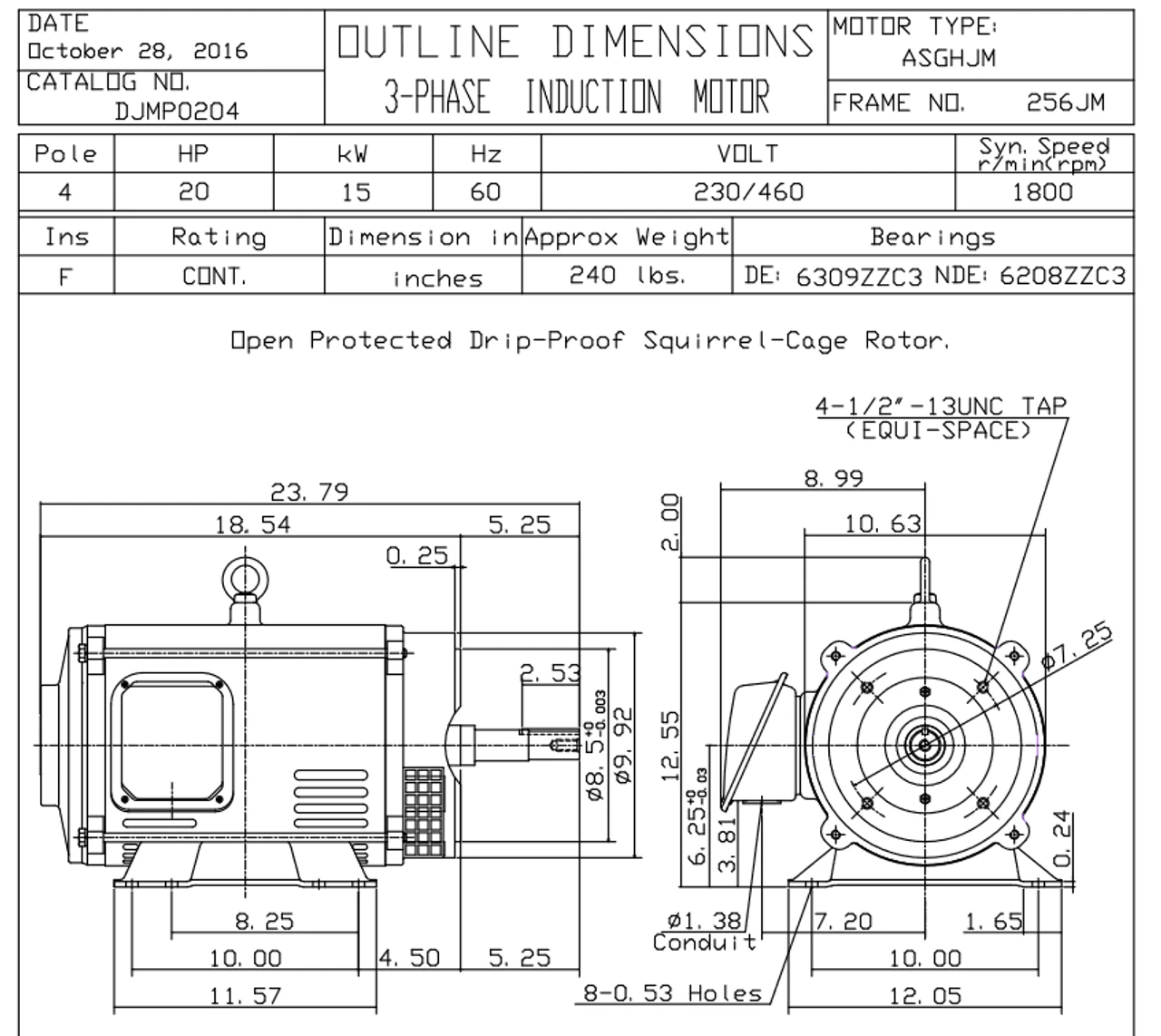 - 20 hp 1800 RPM, 48.5/24.3 amps 230/460 Volts 60hz. Three Phase