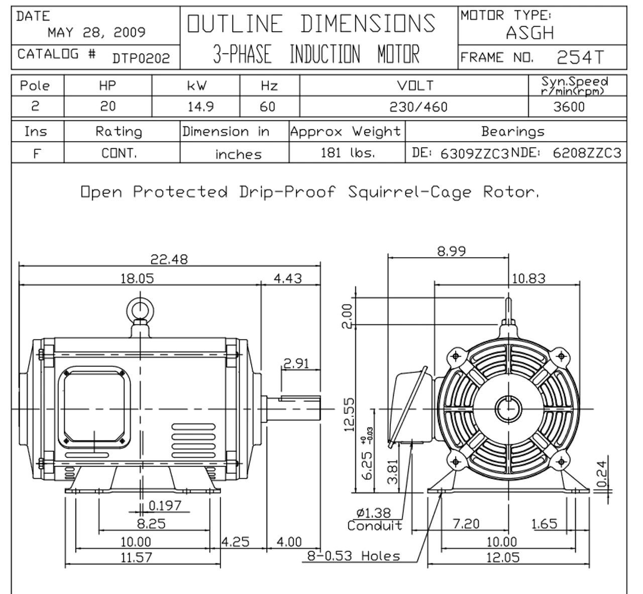 - 20 hp 3600 RPM, 45.4/22.7 amps 230/460 Volts 60hz. Three Phase