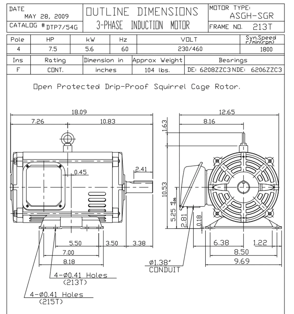 - 7 1/2 hp 1800 RPM, 19.1/9.6 amps 230/460 Volts 60hz. Three Phase