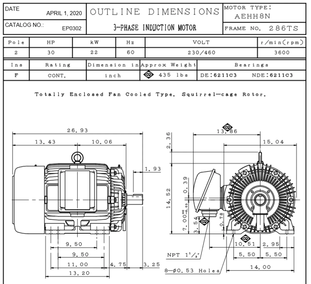- NEMA 286TS Frame, 3 1/4 x 1 5/8″ Dia. Keyed Shaft