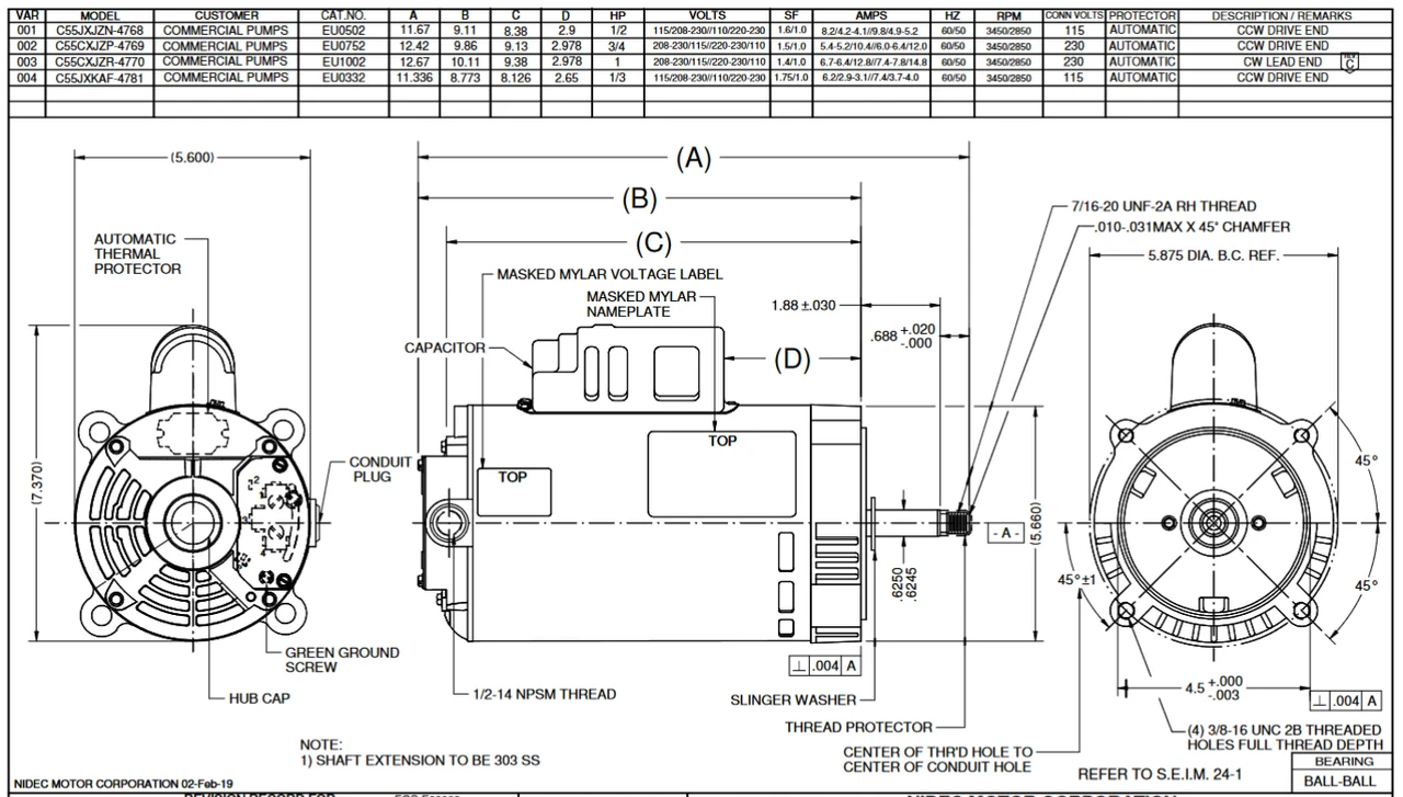 - NEMA 56J Frame, Shaft 5/8″ Diameter x 1 7/8″ Long with threaded tip