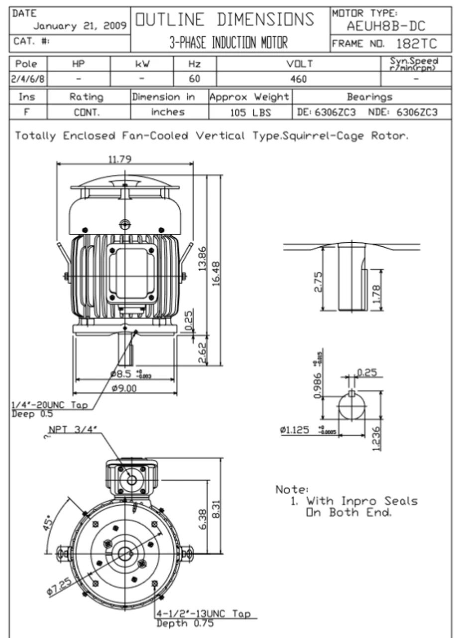 - NEMA 182TC Frame, 2 5/8 x 1 1/8″ Dia. Keyed Shaft
