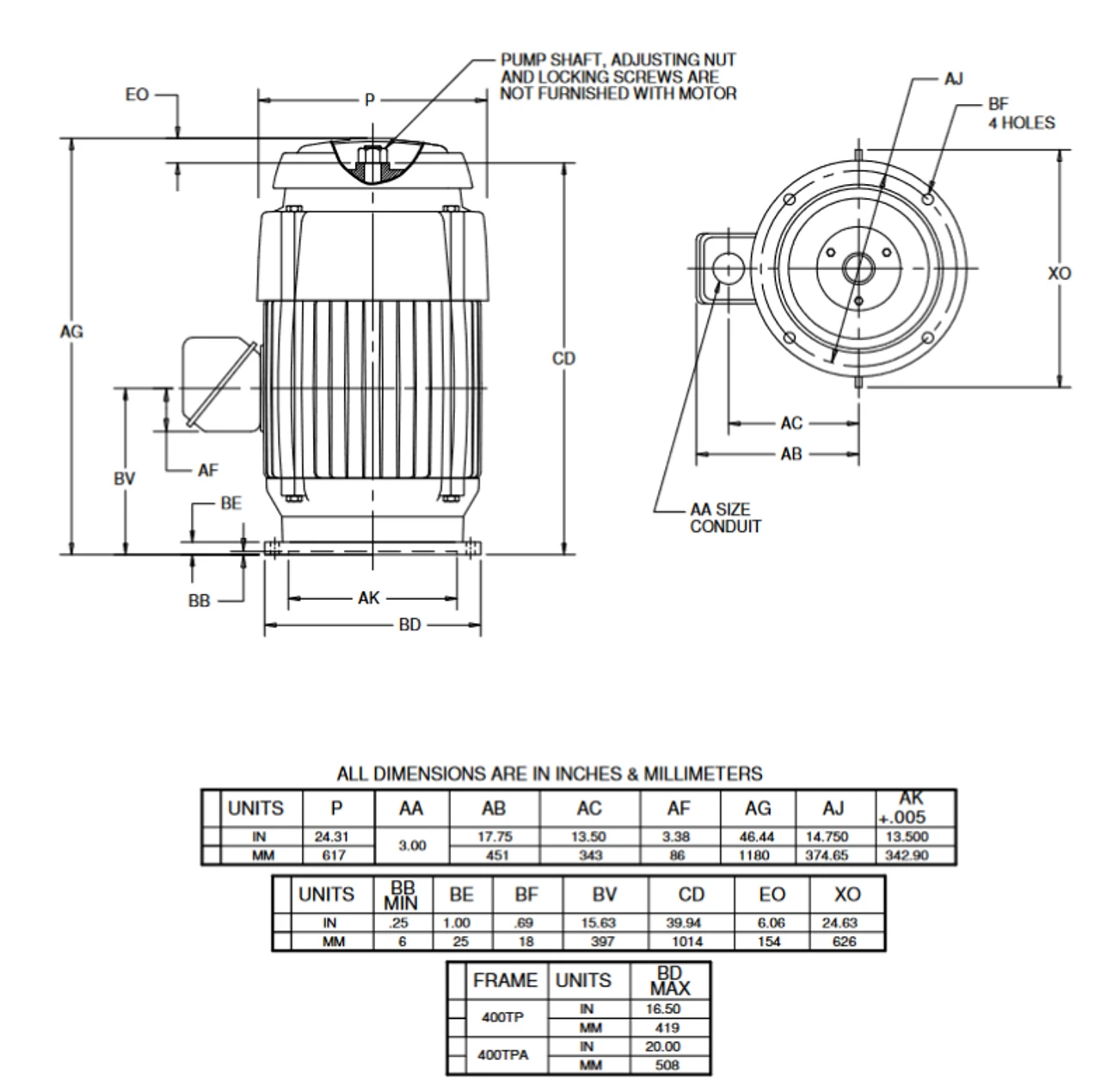 - NEMA 405TP Frame, TUS type, 16 1/2″ Dia. Base, TEFC