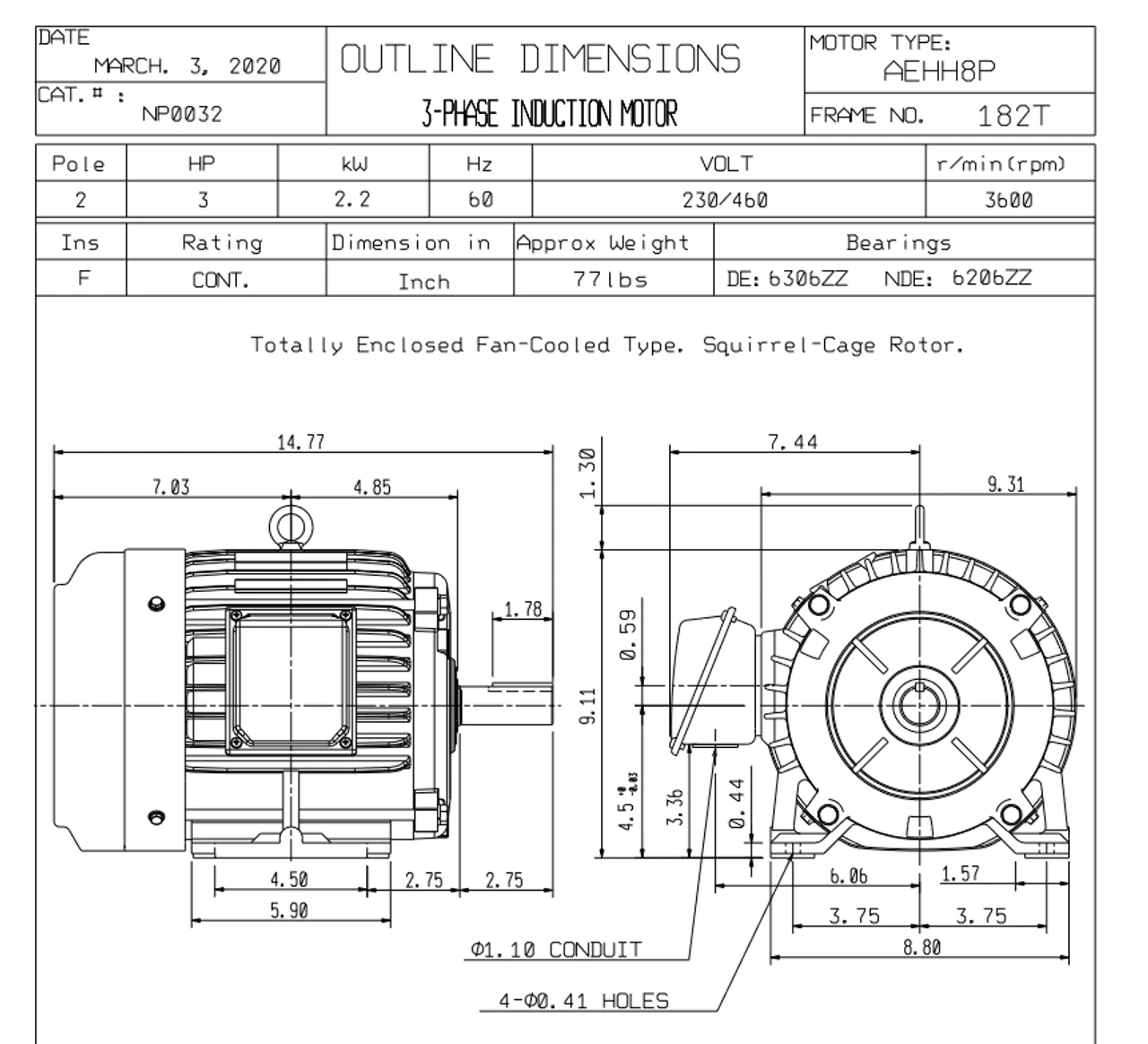 - NEMA 182T Frame, Keyed Shaft 1 1/8″ Diameter x 2 3/4″