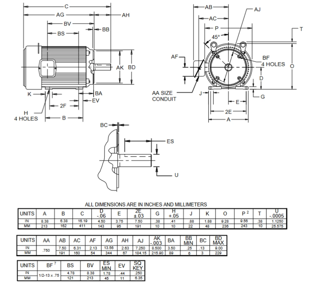 - NEMA 184TC Extruded Aluminum Frame with Cast Aluminum End Bells, Keyed Shaft 1 1/8″ Diameter x 2 3/4″