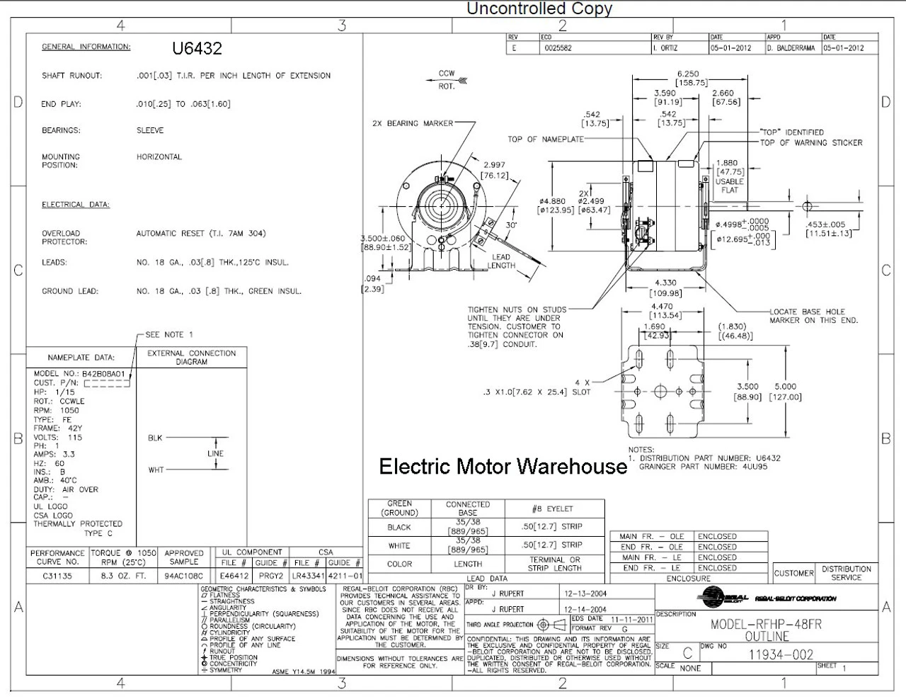 - 1/15 hp 1050 RPM 1-Speed, 3.3 amps, 115V 60hz.