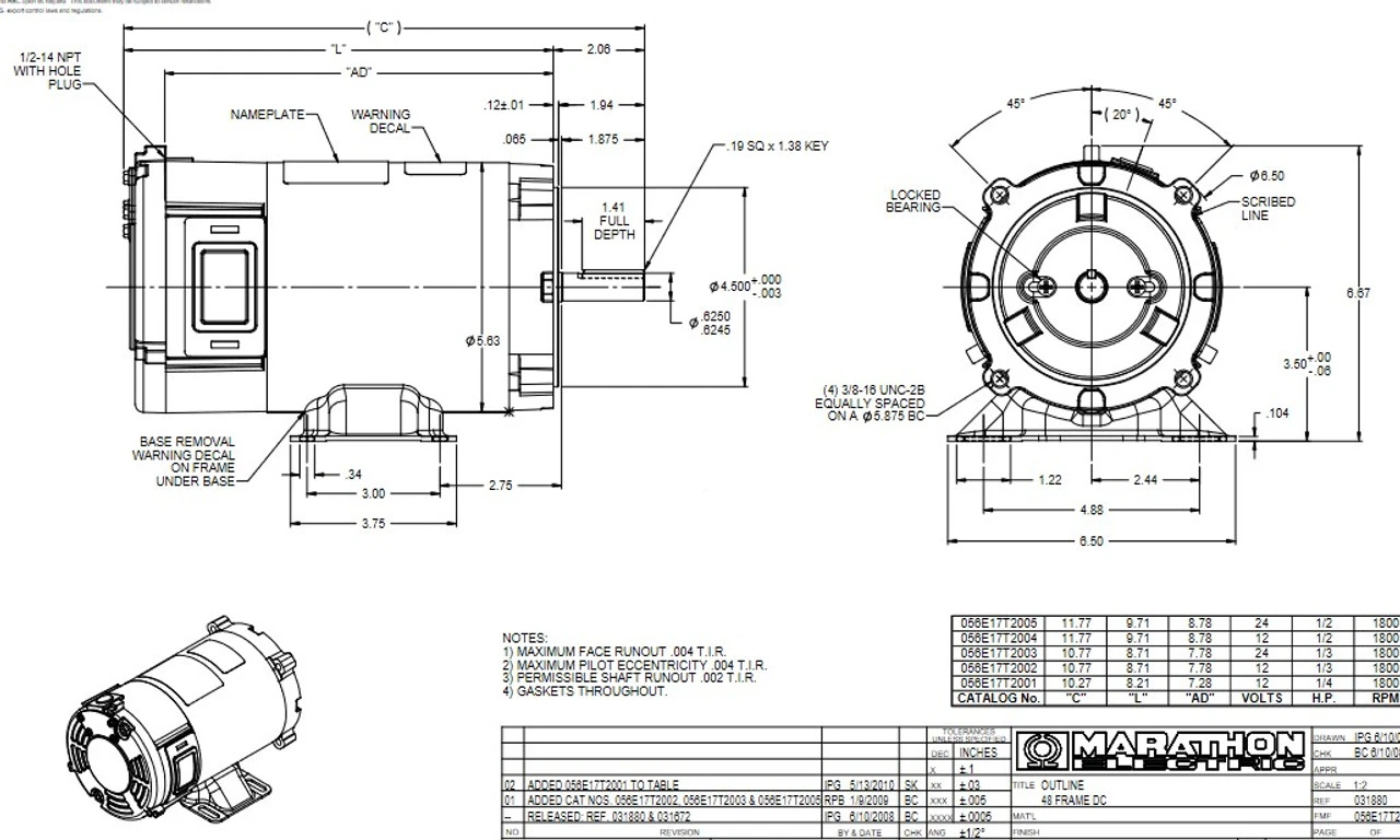 Battery voltage DC electric motor with a C-face mount. Shaft has keyway. Wiring diagram on motor name plate. TENV = Totally Enclosed Non-Ventilated. 056E17T2001